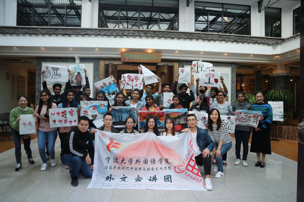 习近平新时代中国特色社会主义思想外文宣讲团走出校园,在古色古香的老外滩李宅开展了“不忘初心 牢记使命”主题教育系列外文宣讲活动之“中国山水 翰墨飘香”宣讲活动,20余名在宁波学习的印度青年参与活动。