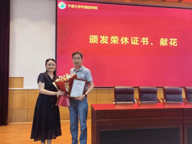 会议伊始,学院为英语系于善志教授举办了一场庄重而温馨的荣休仪式。翁华星书记代表学院向于教授颁发荣休证书,并献上鲜花。