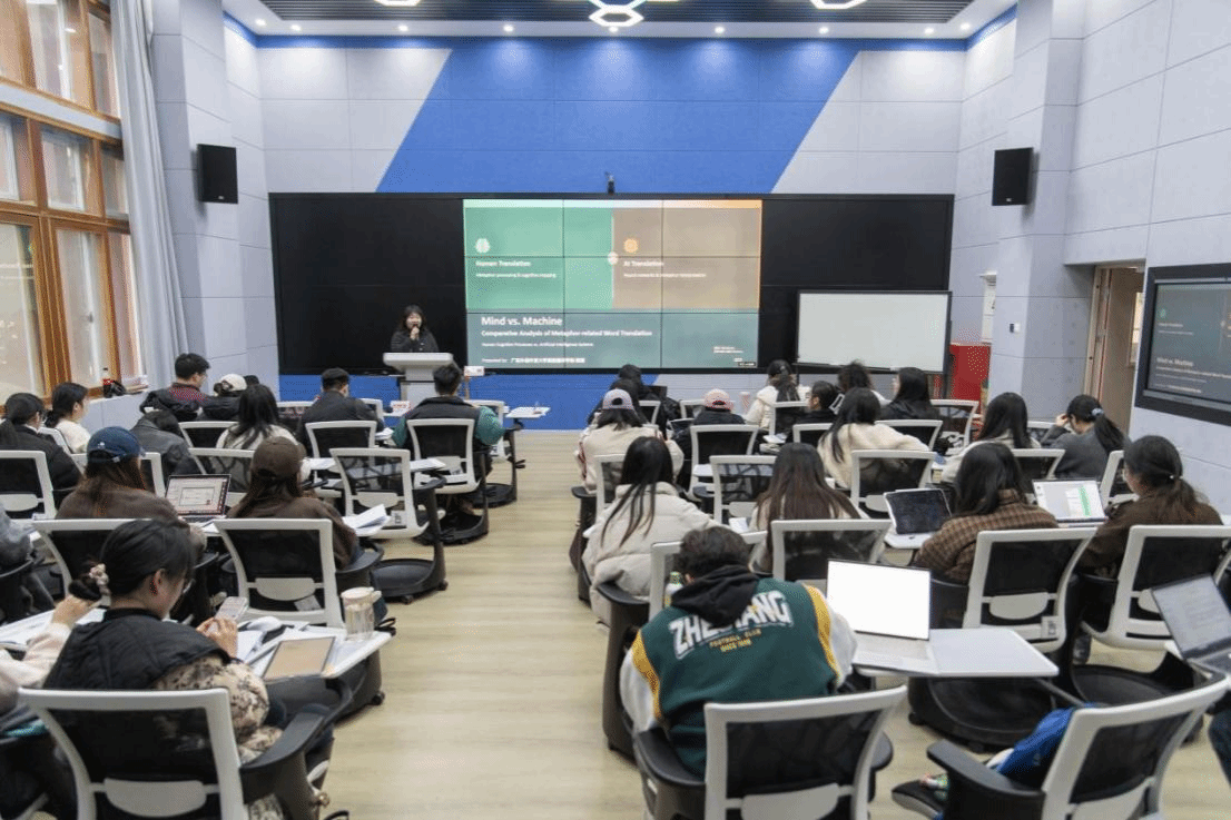 随后,陈教授着重介绍了研究的对比分析环节。她对比了不同AI系统与人类译者在处理隐喻词汇时的表现差异和数据结果,探讨了机器翻译在理解隐喻的深层文化和语境含义上存在的局限性,以及AI在处理创新型隐喻时的失败模式。这些实证数据表明,AI对普通翻译从业者的冲击是现实存在的,唯有具备高度专业性、能够处理高精度要求任务的资深译者,其地位才不可轻易撼动。因此,她强调MTI教学必须适配行业变革,聚焦于人机协作的新模式,着重训练译前编辑和译后审校的实践技能。