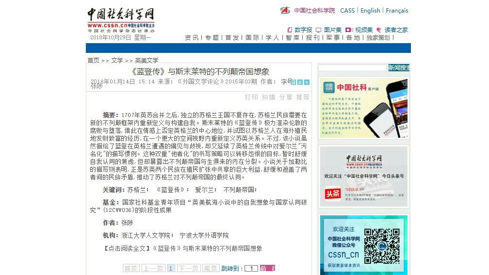 近日,中国社会科学院在其官网主页“学科·成果-英美文学”栏目刊载了高清无码