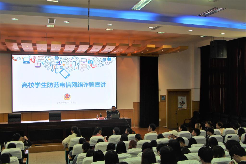 防范电信网络诈骗专题会议在李达三外语楼218报告厅召开。此次会议由学工办陈文祎老师主持,宁波市公安局江北分局王宏强警官主讲,高清无码