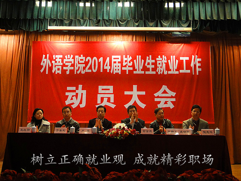 2014届毕业生就业工作动员大会在锦绣小剧场顺利召开。此次大会主题为“树立正确就业观,成就精彩职场路”。会议由院党委书记戚锦阳主持,校学工部副部长俞金波、院长卢植、院党委副书记倪志华、副院长于善志、王红阳、各系主任、班主任、辅导员出席会议,高清无码