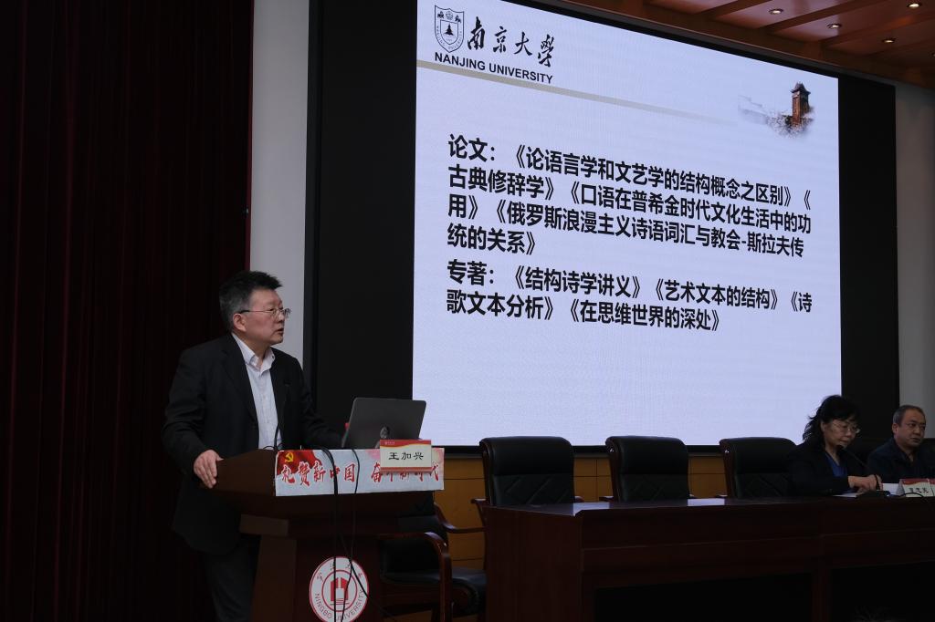 会议期间,专家们进行了14场大会报告。在4月17日上午的主会场有6场大会报告。中国人民大学耿幼壮教授做了“关于外国文论译介与研究的几个问题”的发言,就外国文论在中国接受过程中的内涵演变与发展倾向及其与中国元素的互动与融合进行了深入的阐述。浙江大学周启超教授介绍了国家社科基金重大项目“现代斯拉夫文论经典名篇汉译与大家名说研究”的进展与问题,展示了课题组阶段性研究成果,认为雅各布森百年前提出的“文学性”在文学研究中具有话语史、学术史、思想史价值,在今天的世界文学与比较文学研究实践中还有现实意义,强调外国文论引介要超越“粗放”,进入“深耕”。 北京外国语大学马海良教授在“西方文论的真理话语系统”的报告中,认为真理话语是西方文论的主导范式,广泛渗入文艺创作实践,而后现代文论实则上是对真理话语传统的反噬。浙江工商大学蒋承勇教授作了“‘现实’与‘浪漫’:矛盾中的‘勾连’”的演讲,就现实主义与浪漫主义的关系进行了深入的考辩,认为坚持现实主义本原性特质研究可为建构有中国特色的外国文学和文学理论学科体系、学术体系和话语体系提供支撑与支持。复旦大学汪洪章教授做了“关于中西形式论话语的一点比较”的报告,认为关于文学作品首尾圆合、有机一体的论述在中西文论史上历来有之,并以《文心雕龙》为例,与西方文论家的相关论述进行了比较探讨。上海大学曹谦副教授在“苏联审美学派及其争论与1980 年代中国文艺本质的讨论”的报告中,认为上世纪八十年代苏联美学和文论特别是苏联“审美学派”及其争论的译介研究与我国当代文论转型发展构成了相互促进的互动关系。兰州大学朱刚教授作了题为“理论可以‘旅行’吗?”发言,就赛义德的“Traveling Theory”(一般译为“旅行理论”)的准确译法从词源上做了解析,认为“Traveling ”应该译为“飘移”更为贴切,因为“飘移”本身所含的播撒性、互动性、地域性和批判性都与赛氏的后殖民理论相契合。