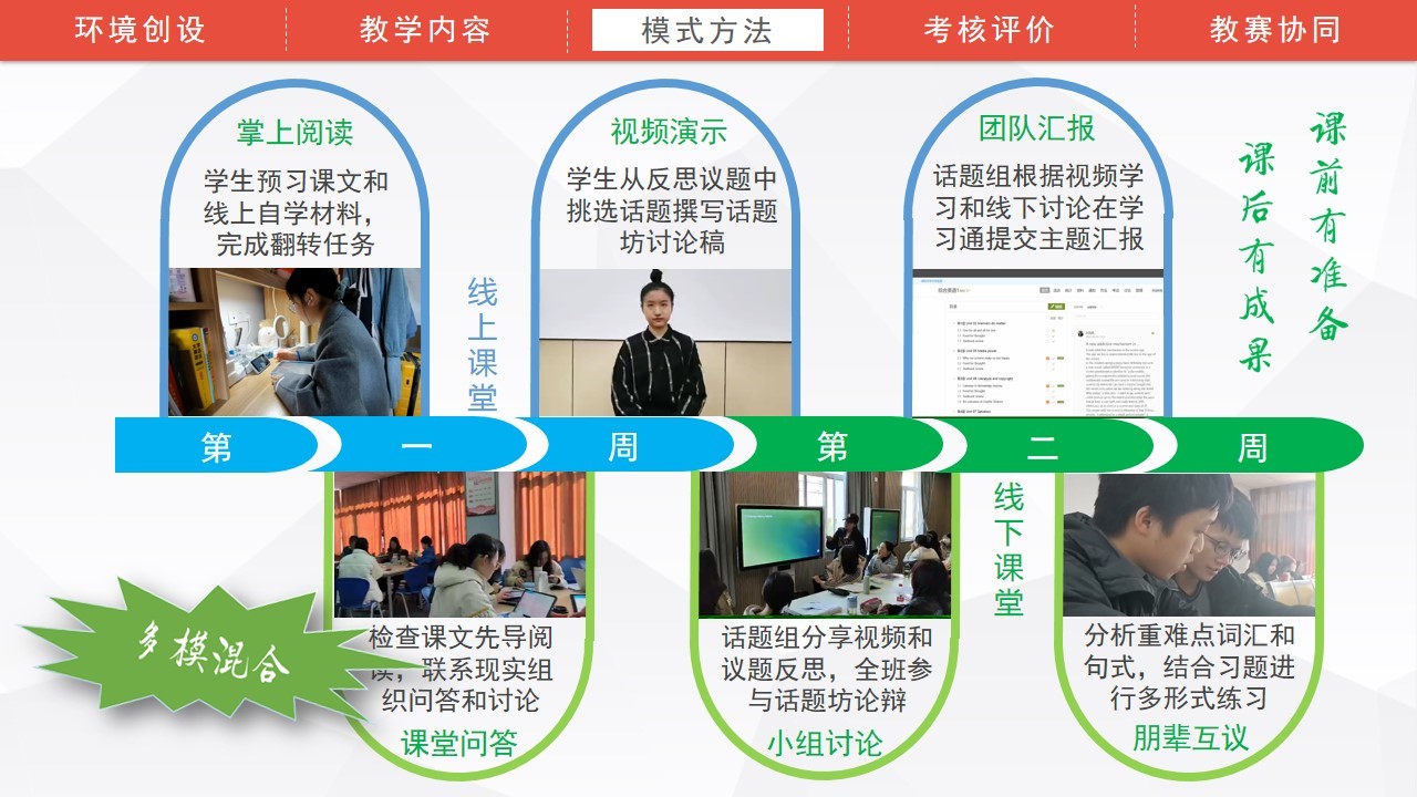 l 课程创新简介:针对教材内容陈旧、学生说写技能转化率低、自主学习能力不足等基本学情,团队采用混合式教学手段把现代信息技术融入“综合英语1”课程的升级改造,推动“新文科”知识的增量建设。本课程倡导输出倒逼式教学理念,采取了六点创新举措:1)整合平台资源,构建多模态沉浸式学习环境。2)导入线上高质内容视频,对教材进行二次开发,启智开慧。3)组织多种活动形式为教学赋能,培养学生的自主学习和合作学习能力。4)突出课程评价的引导、纠错和选拔功能,以评督学、促学。5)授课内容融入思政元素,德知共进,三全育人。6)教赛协同,以赛助教。通过课程创新,团队在学科竞赛、教学比武和教研项目上均取得佳绩,也收获了同行好评。
