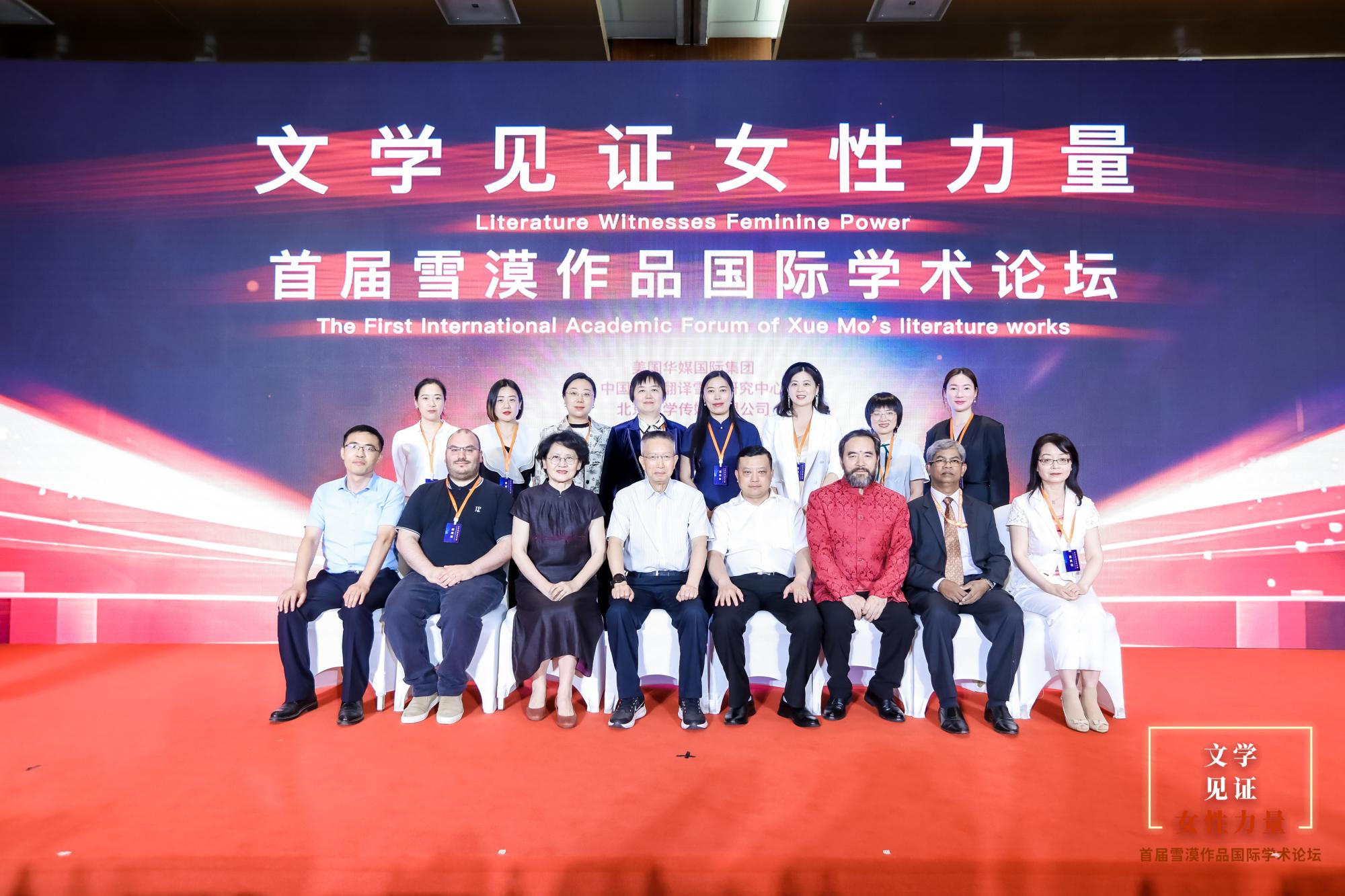 (第一排左二:中法文化交流协会主席安东篱:左三:中国出版协会副秘书长刘丽霞;左四:中国当代文学研究会副会长、北京大学中文系教授陈晓明;右二:斯里兰卡海王星出版社社长丹尼斯•库拉顿加;右三:知名作家雪漠;右四:中国外文局翻译院院长黄玉龙)
