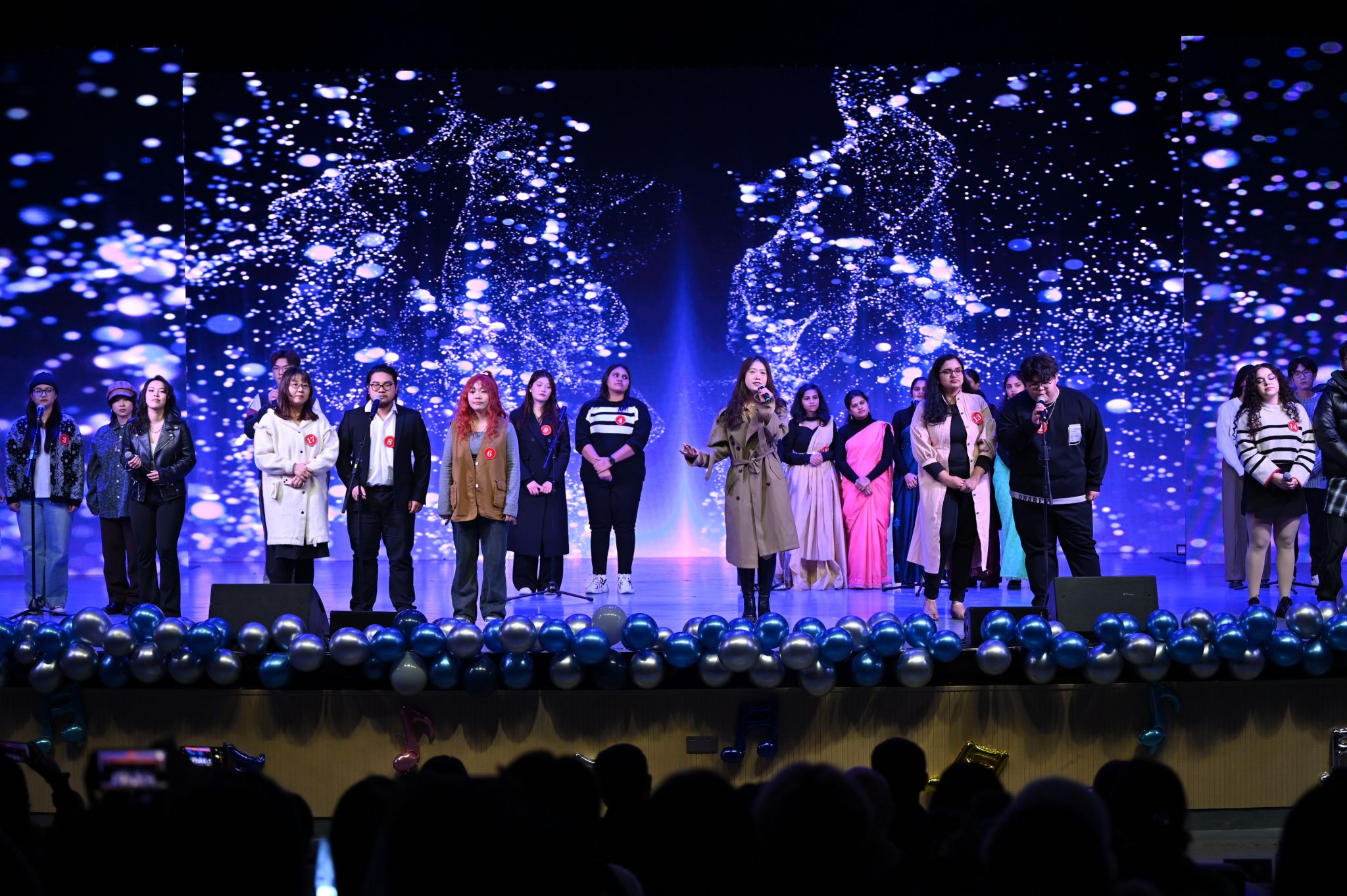 晚会在全体选手共同唱响的we are the world和《爱因为在心中》的歌声中拉开帷幕,中外大学生用深情的歌声传递了天下一家与世界和平的美好愿景。在场的观众默契地配合音乐节奏,挥舞手中的荧光棒,与台上的选手同频共振,点点星光随音乐舞动,汇聚成璀璨的星河。