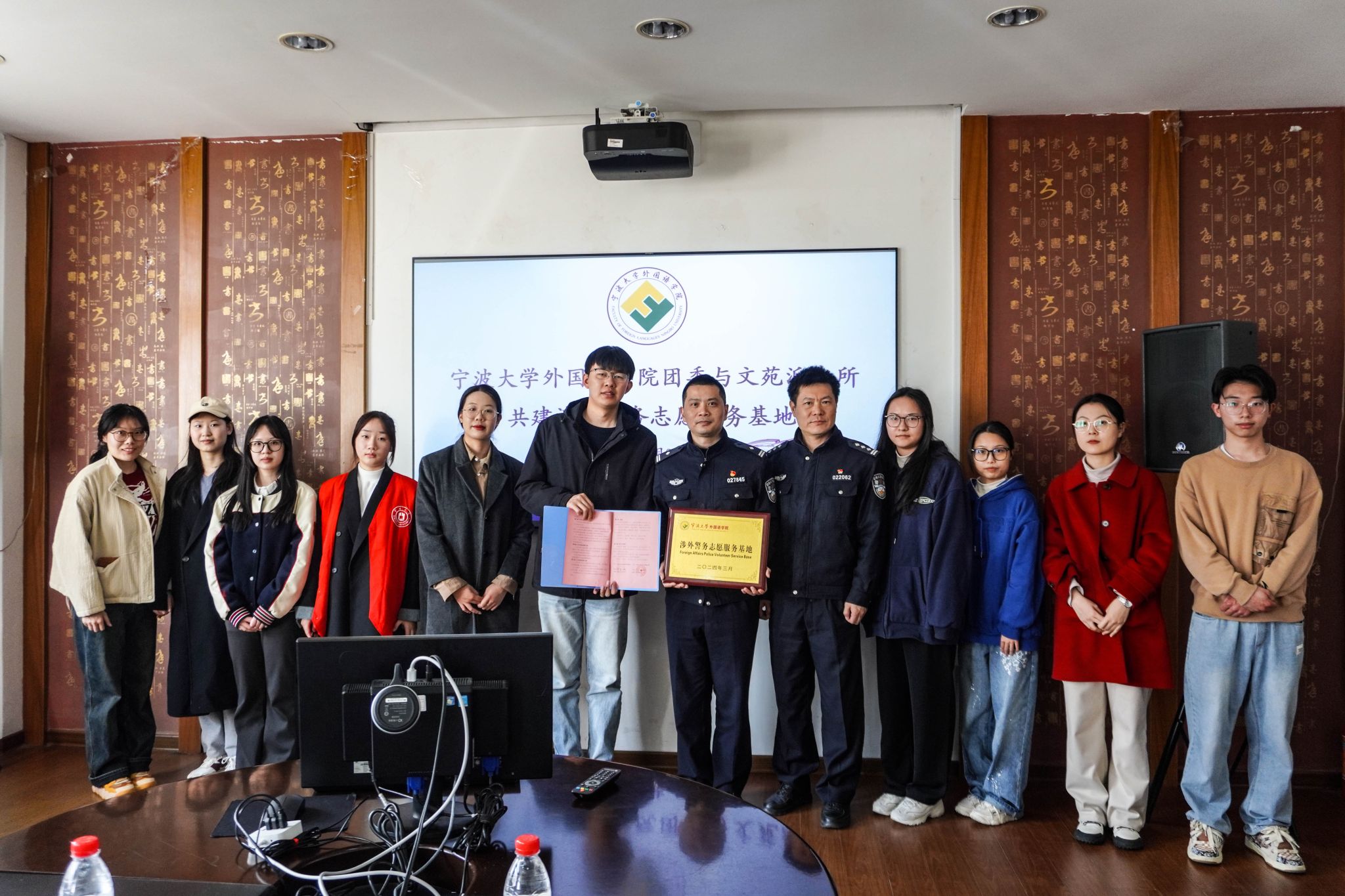 与文苑派出所共建涉外警务志愿服务基地签约仪式在李达三外语楼422会议室举行,学院团委书记檀学敏、辅导员范紫婴,文苑派出所所长杨凯和部分警官,学院青年志愿者代表参加了签约仪式。