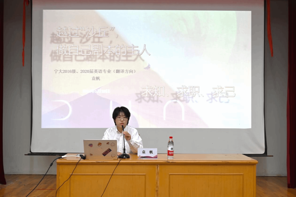 5月18日上午,宁波大学外国语学院“领航未来·校友故事会”第六期精彩开讲。浙江省人民政府外事办公室干部、上海外国语大学高级翻译学院英语口译专业研究生、宁波大学外国语学院2020届英语系校友袁帆应邀担任主讲人。外国语学院党委副书记胡佳、党建辅导员、校友工作联络人和130余名本硕学生参加本次活动。