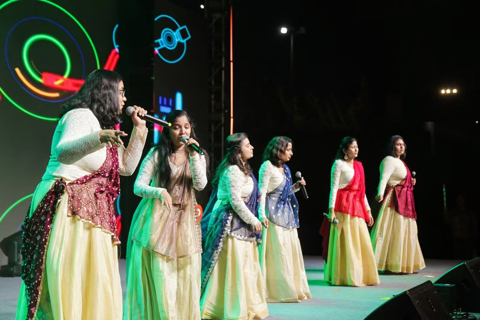 西区田径场华灯璀璨、热闹非凡,“You & Me Toast to the Future”第二届中外大学生外文音乐交流大赛决赛精彩落幕。来自摩洛哥、亚美尼亚、印度等国的17名国际学生,与16名中国学生携手并肩,以音符作笔、旋律为墨,勾勒出一幅无界的友谊长卷。汉语、英语、法语、德语、日语、印度语等9国语言在动人旋律中穿梭,编织着友谊经纬,搭建起跨国界的心灵之桥,为观众呈上文化交融魅力的视听盛宴。1100余名中外学子共同见证并沉浸在这一音乐盛宴中。