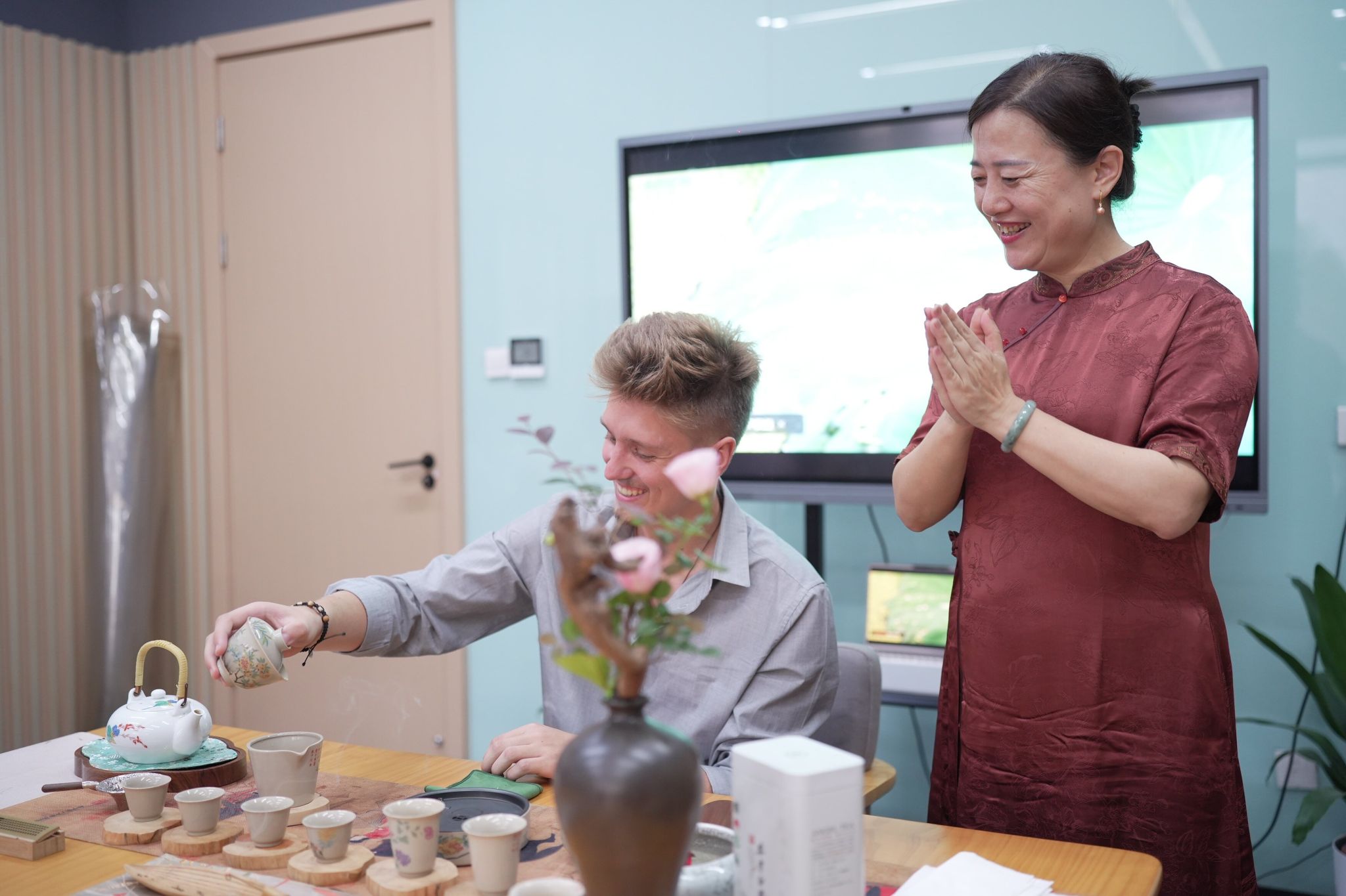 高清无码 林艳副教授的“茗心雅叙——中国茶道美学与品鉴沙龙”主题讲座以一盏清茶为媒,向学生们介绍了茶道的历史与文化意蕴,并现场展示茶艺。波兰学生亲手尝试泡茶品茗,在茶香氤氲中体悟东方生活美学与“和敬清寂”的精神内涵。