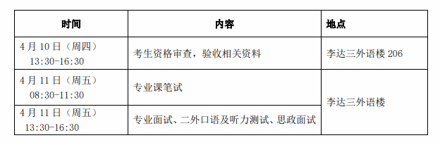五.我院所有招生专业均采用现场面试方式。调剂考生复试时间拟定于4月11日。复试形式及时间安排如下(考生凭身份证和准考证进校):