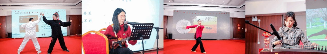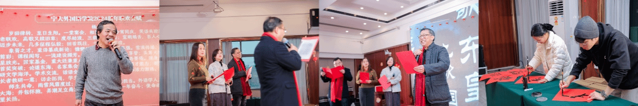 由各协会教职工代表准备的精彩节目使得现场掌声雷动,老师们所展现出来的与工作中不同的一面也使得大家眼前一亮。一首首经典歌曲宛转悠扬,双语朗诵《楚辞》尽显外院“笃信达雅”,乌克丽丽、古筝弹奏令人耳目一新,瑜伽、脱口秀带你领略不一样的外院风采。杨成虎老师更是为此作《宁大外国语学院2024年新年联欢会赋》,“迈步未来,几多征程弘毅;回看既往,十五大事辉煌”,洋洋洒洒细数外院一年奋斗,“使命必达,征帆万里长扬”。