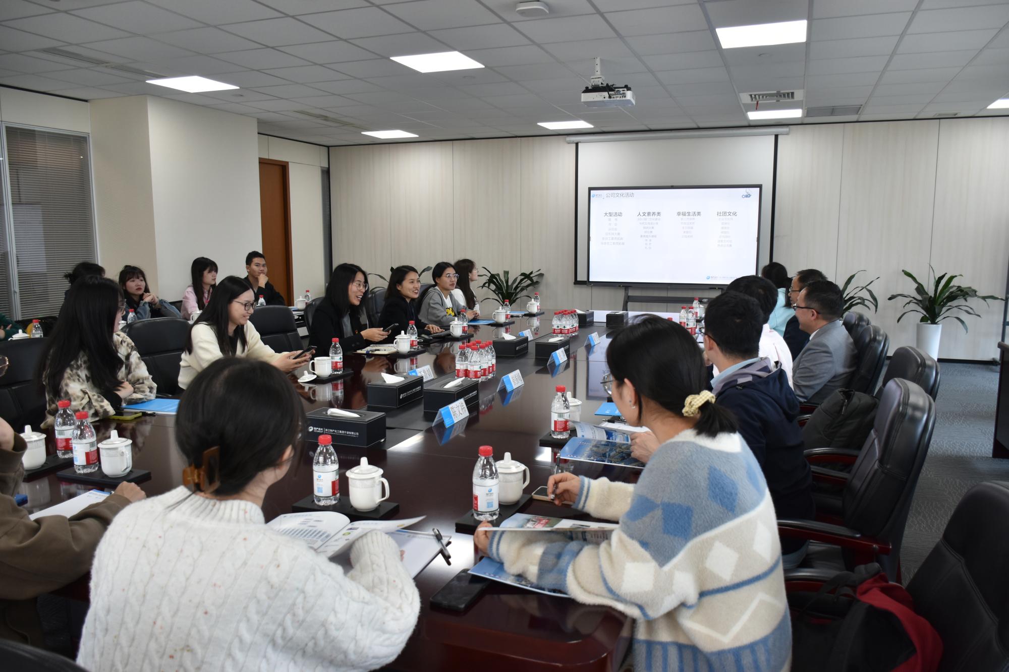 学院师生与公司代表在会议室举行座谈,张晨详细介绍了公司的发展历程、公司定位、发展战略方向以及企业文化,并介绍了当前在公司任职的杰出校友。高春燕从自身经历出发,分享了外语专业毕业生在公司的发展历程,阐释了对“实事求是、经世致用”的校训和“做人、做事、做学问”的深度理解,她也结合公司发展理念,希望同学们在大学学习期间应该保持对生活的热爱,在保证身体健康的同时提高自身的学习能力和综合素养。随后,副院长张陟向与会代表介绍了外国语学院的发展情况,表示希望能以学院人才培养方案改革为契机,将专业实践课与企业实习、就业打通,为社会培养契合企业发展要求的毕业生,双方在这一点上也达成了共识。副院长陶久胜就学院与企业的科研合作、横向项目设立、研究生实习实践平台搭建等事宜与企业代表深入沟通,期待未来有更多的合作可能。