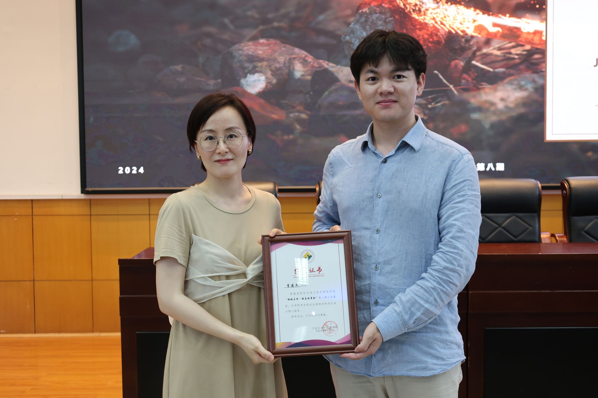 学院党委副书记胡佳在讲座结束后为李建文颁发纪念证书,感谢李建文校友对母校学生职业生涯规划和专业学习做出的热心建议。