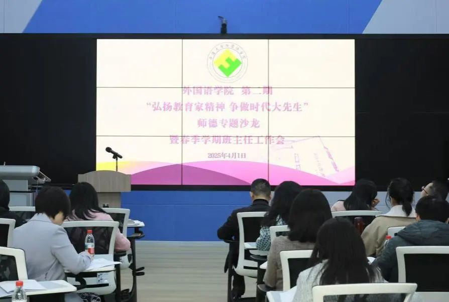 4月1日下午,外国语学院党委组织开展了“弘扬教育家精神 争做时代大先生”师德师风专题沙龙暨春季学期班主任工作会议,特邀宁波大学“五老”师德宣讲团成员朱福建老师做主题分享。学院党委书记翁华星、副书记胡佳、学生工作负责人冯能跃、全体教师党支部书记、全年级各班班主任和全体辅导员、2023以来新入职教职工共50余人参加活动。会议伊始,进行2023-2024学年宁波大学优秀班主任、外国语学院优秀班主任、2024年度宁波大学优秀辅导员、2024年外国语学院班主任就业工作先进个人的表彰仪式。