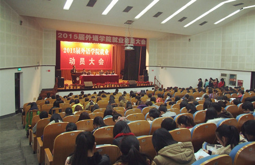 12月3日下午,外语学院2015届毕业生就业工作动员大会在锦绣小剧场顺利召开。会议由院党委书记戚锦阳主持,校学工部副部长邬备民、院长卢植、副院长于善志、王红阳、院党委副书记倪志华、各系主任、班主任、辅导员出席会议,外语学院2015届全体毕业生参加了此次会议。