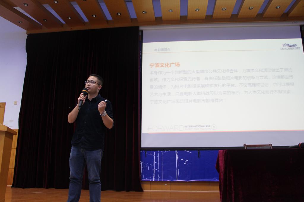近日,2015宁波文化广场国际短片电影周校园行第一站在宁波大学外语学院拉开了帷幕。此次宣讲会在李达三外语楼218报告厅举行,宣讲会的主要内容分为短片电影周介绍、特选影片展映以及现场互动三个环节。