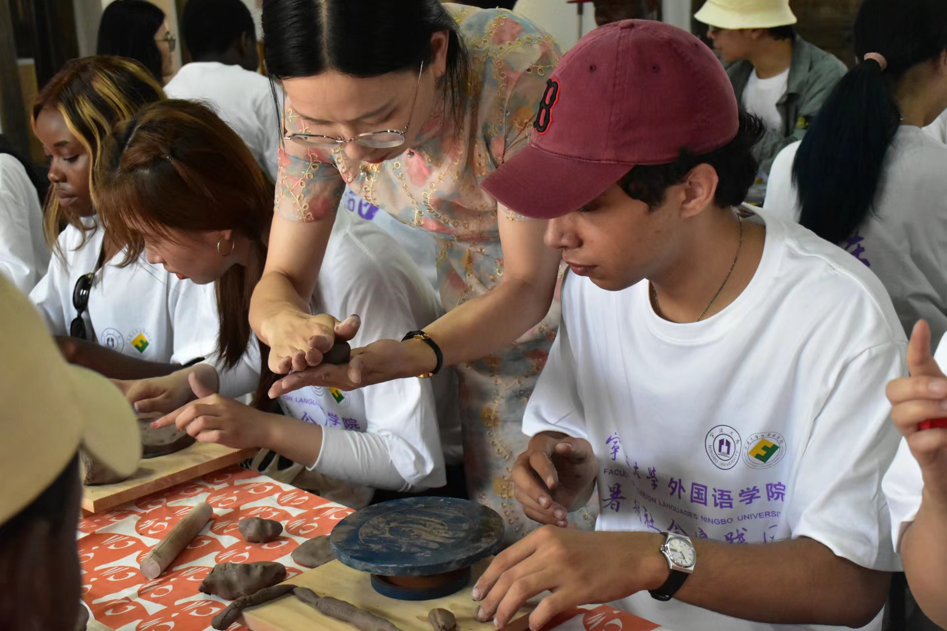 天童老街在改造过程中秉承“修旧如旧,还街于民”的理念,还原了老街昔日的风貌,借着乡村振兴的东风蜕变重生,重燃人间烟火气。村民们在家门口开上小吃店、体验馆、农家乐……,“东窑”海丝陶瓷研学基地就是其中一家。在这里,制陶老师向中外大学生介绍了陶瓷的历史知识与基本工艺,并在老师的指导下动手制作陶塑,于手势的起承转合中感受到了陶瓷文化的悠长。许多留学生都完成了人生中的第一个陶艺作品,喜悦之情溢于言表。