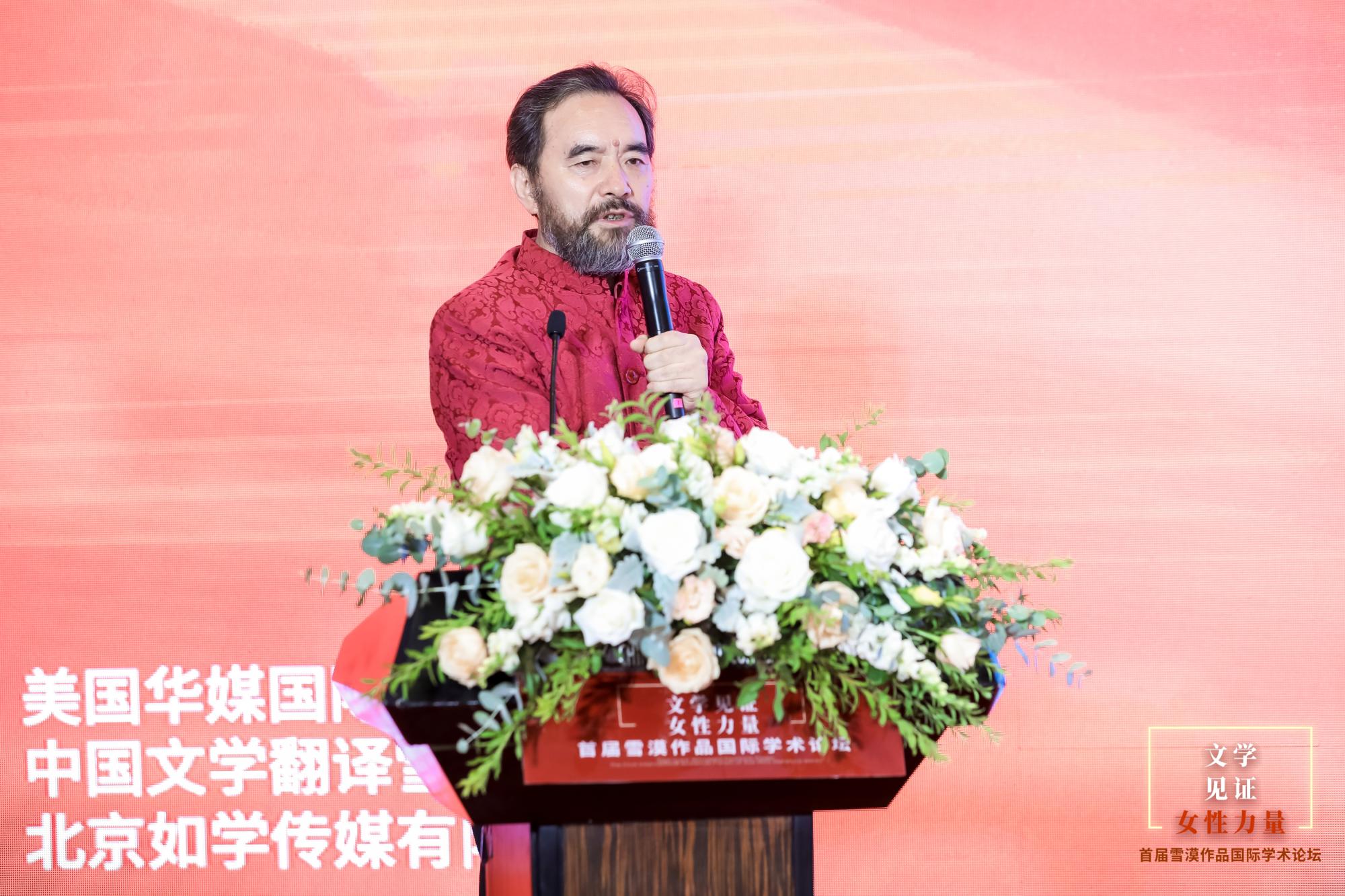 国家一级作家雪漠发表题为“母性力量的救赎”的主题发言,从历史视角批判集体无意识,即暴力价值观的渗透,讲述了其史诗巨作《娑萨朗》的价值观,倡导重建母性的和平价值观,以和平与爱取代王侯将相的英雄史诗宏大叙事。