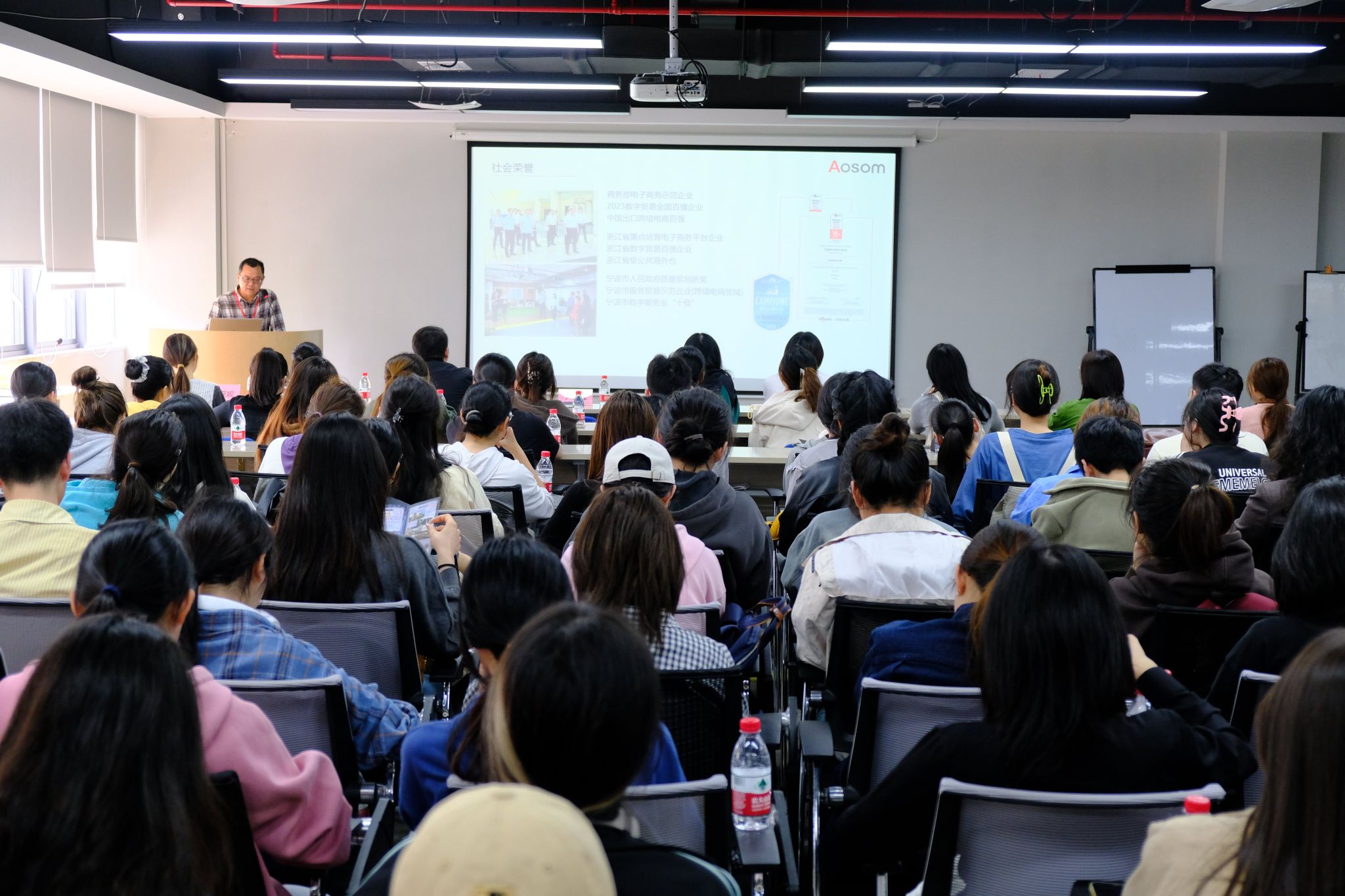 活动中,公司副总经理卢云峰从宏观角度向学院师生介绍电商的总体概况、发展趋势等,重点指出遨森电商站稳脚跟并不断发展壮大的品牌、本地化、海外仓、独立站、全价值链等各方面优势。人力资源部经理倪成从微观角度全面介绍企业的发展历程、文化理念、人才培养体系、薪酬体系、招聘流程等内容,让全体师生了解企业十大社团等文化活动及MP人才培养模式下的多方位发展渠道。