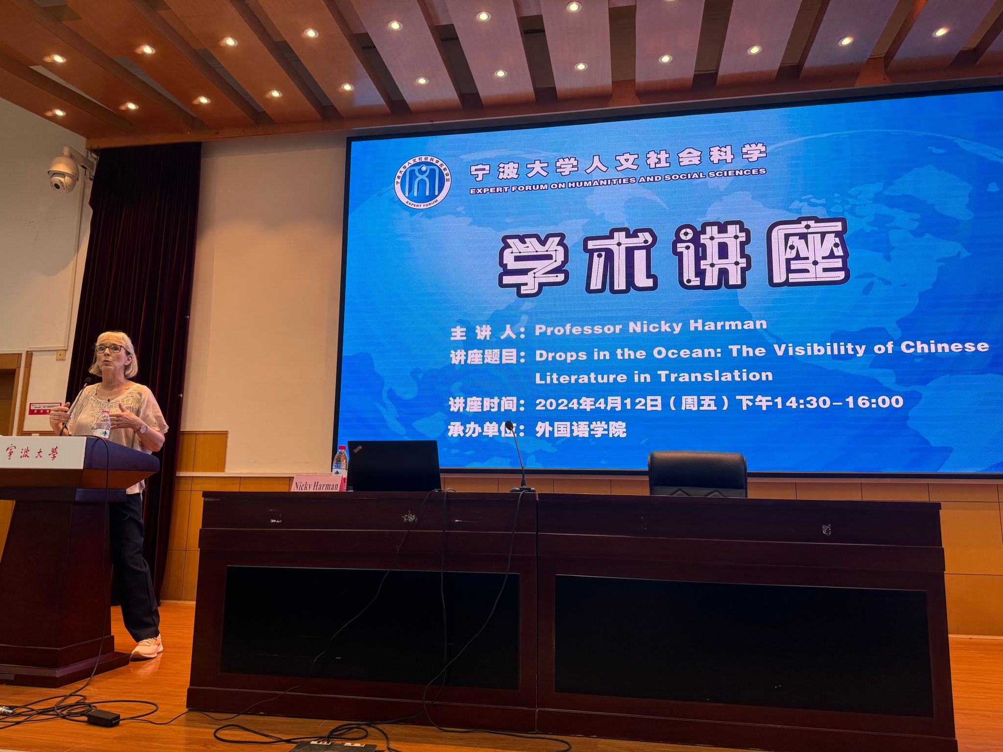 4月12日下午,应宁波大学外国语学院邀请,英国著名翻译家韩斌(Nicky Harman)为我院师生做题为“Drops in the Ocean: The Visibility of Chinese Literature in Translation”的线下讲座。本次讲座由徐赛颖副教授主持,学院师生百余人参加了此次讲座。